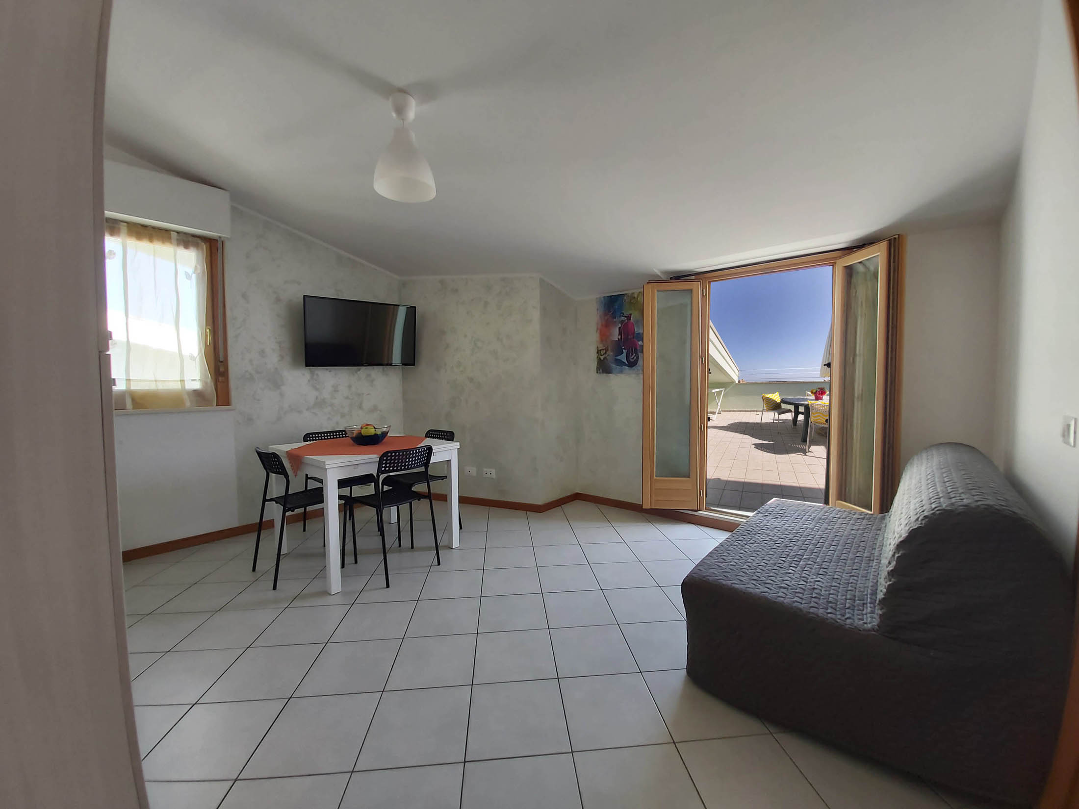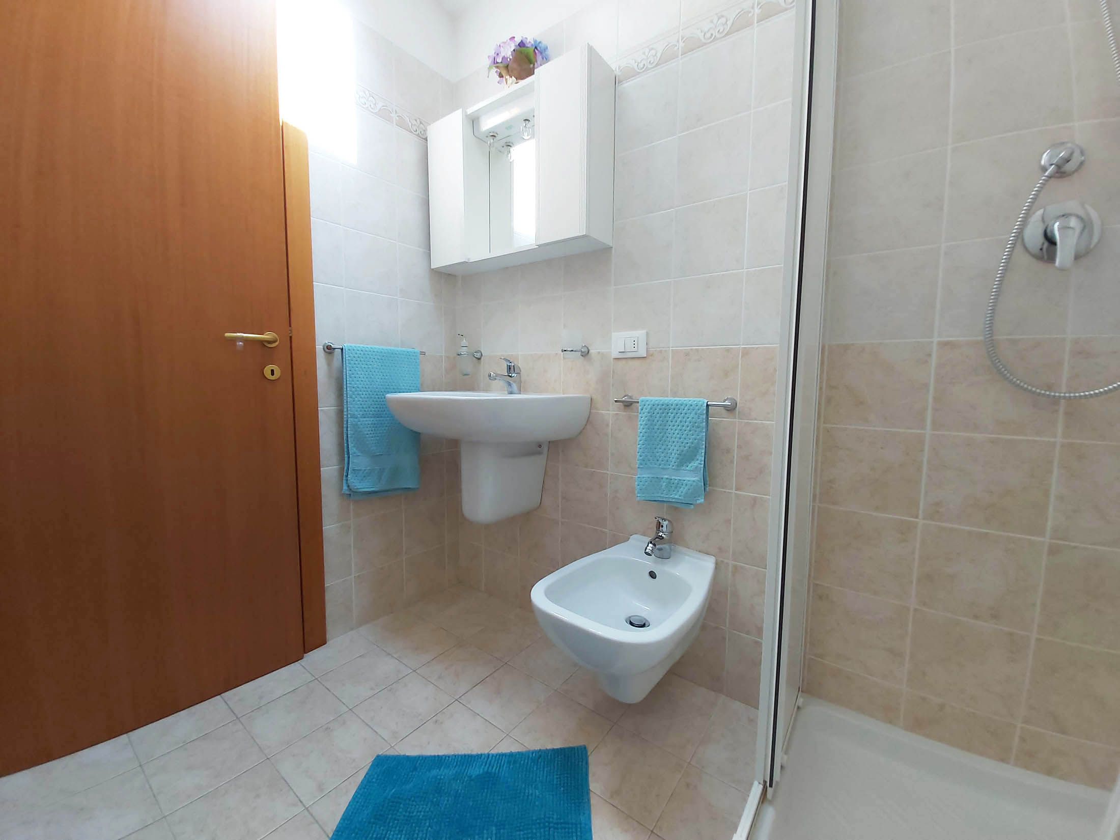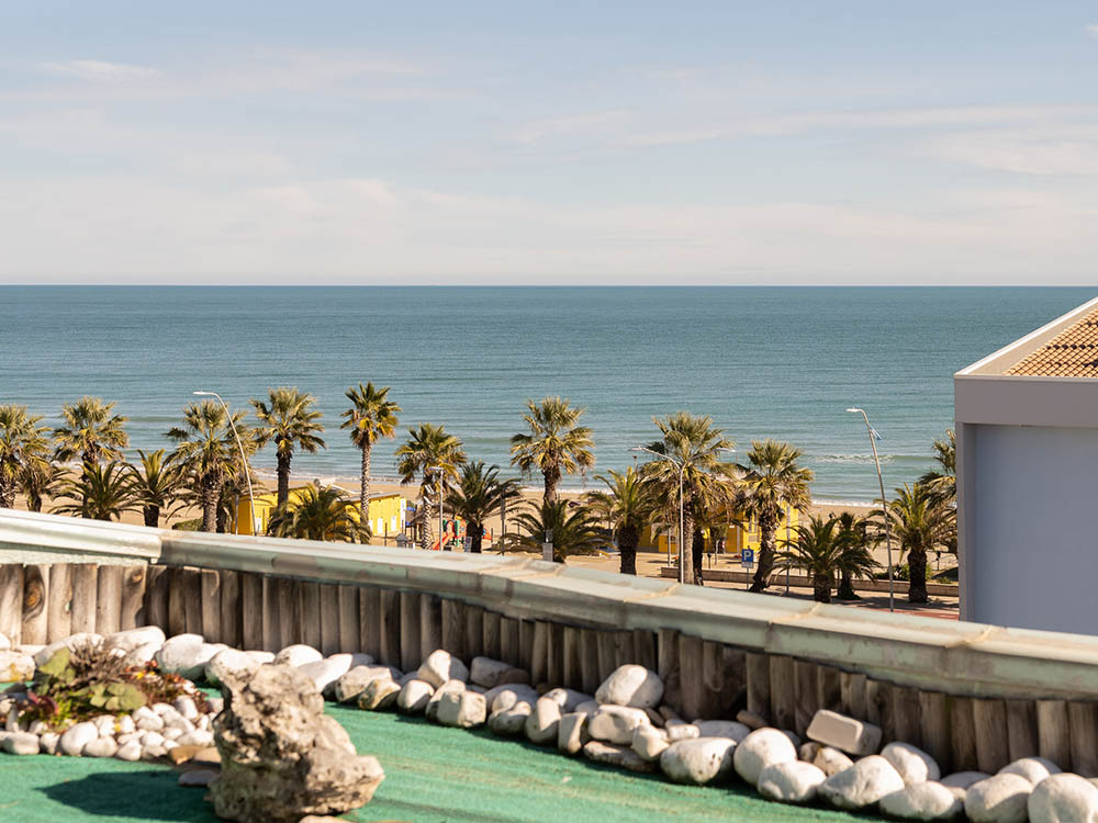 The interior of our apartment is 60m2. The large outside balcony overlooks the beach and the sea and is equipped with a table and chairs. Inside, the common space has a kitchen and a sofa-bed for 1 adult.The kitchen is fully equipped with kitchenware, static and microwave ovens, fridge and freezer, coffee machine for Nespresso or similar capsules. There is bathroom with shower, a bedroom with a queen size bed and another small bedroom with a bunk bed that can accommodate 2. The apartment has a flatscreen HD TV, air conditioning, washing machine, iron and ironing board. There is a hairdryer is in the bathroom.
